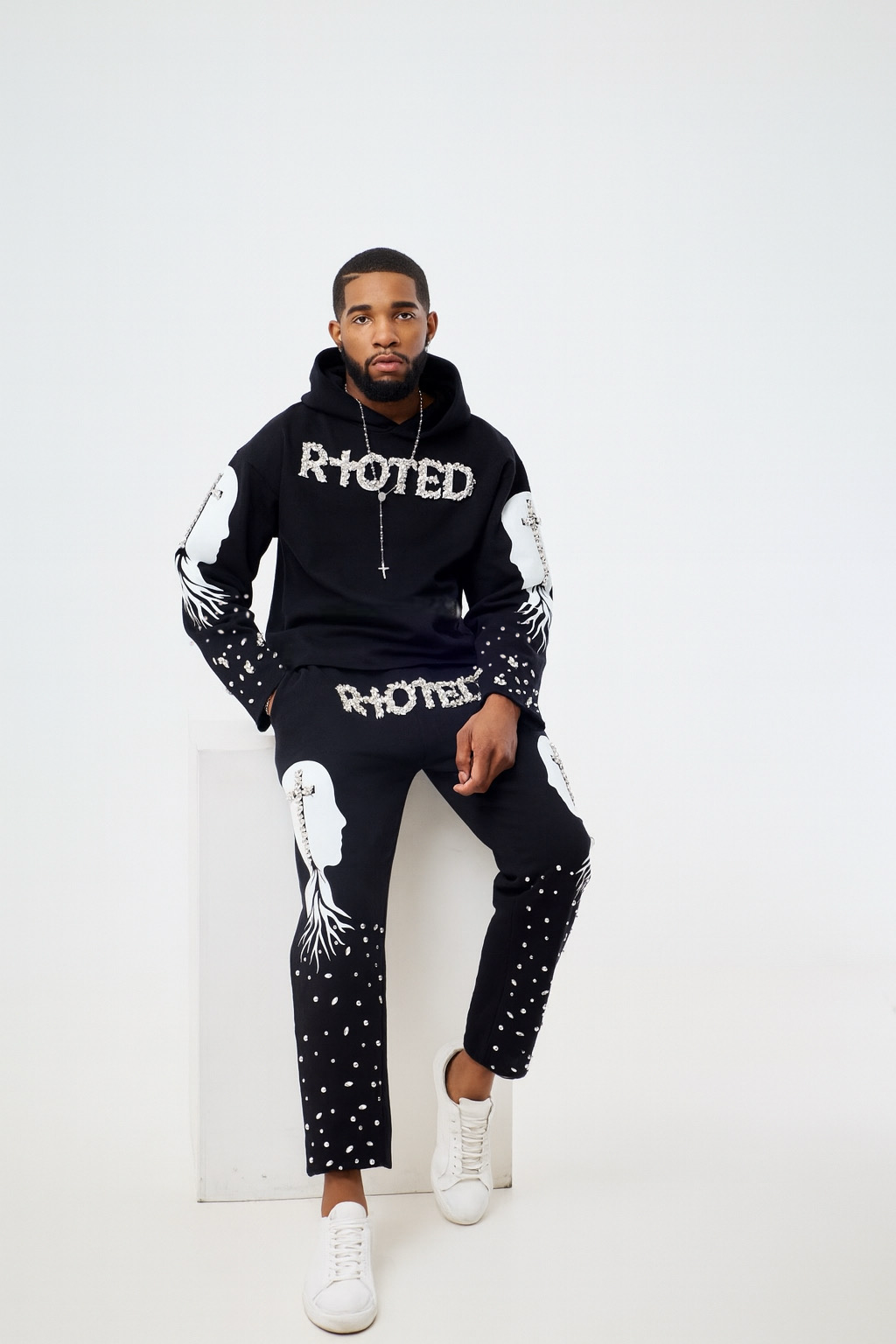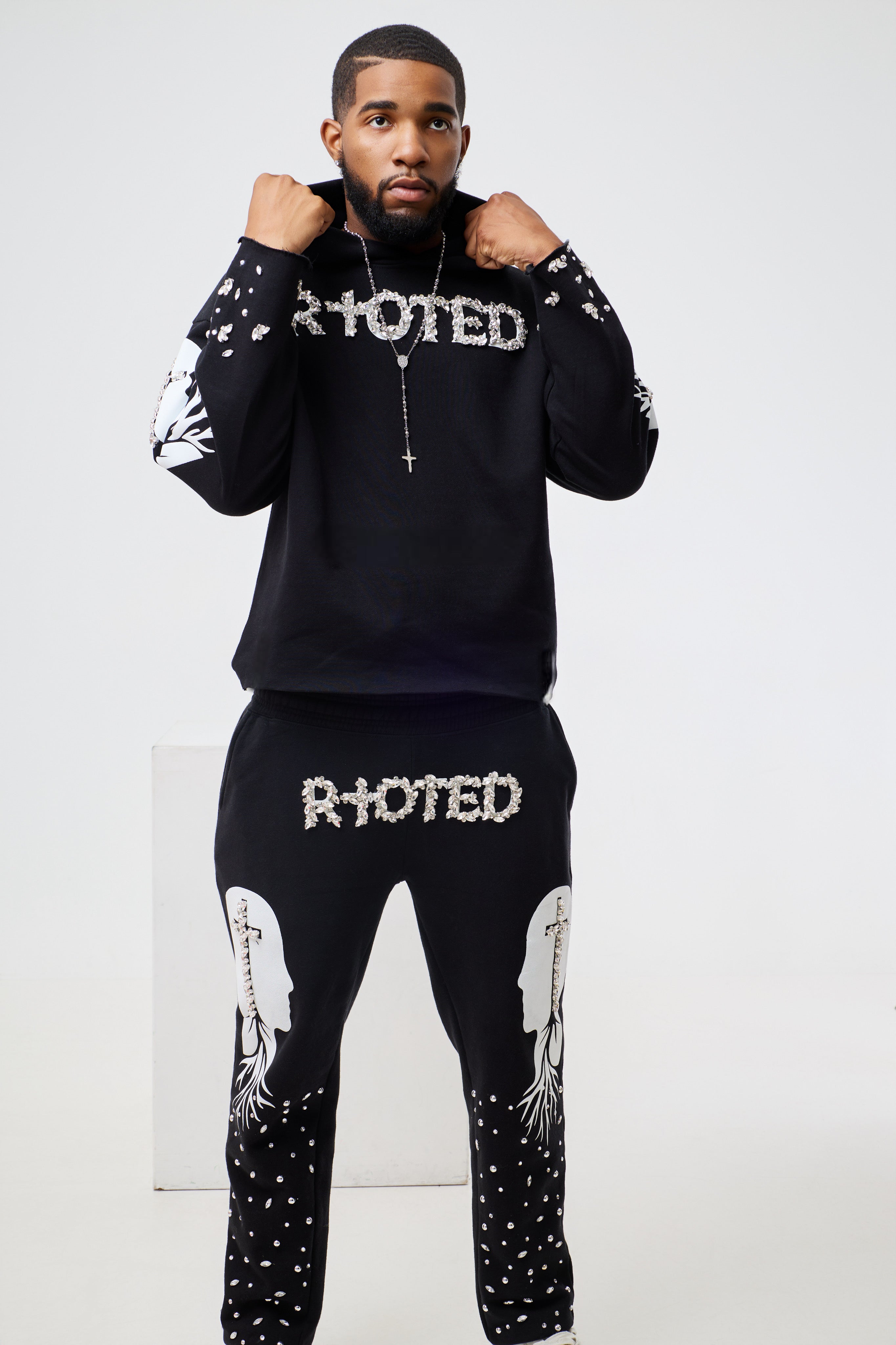 Black "RIOTED" Crystal & Graphic Heavyweight Sweatpants